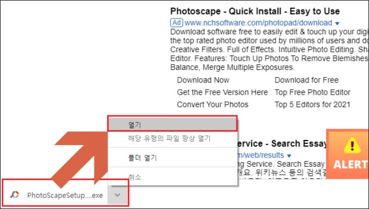 구글 크롬 브라우저 기준으로 화면 우측 하단을 주목해주셔야 합니다. 그럼 포토스케이프 exe 파일 열기 창이 뜨게 되는데요. 아래로 향한 화살표 체크박스를 클릭하신 뒤 맨 위의 '열기' 버튼을 클릭해주세요.